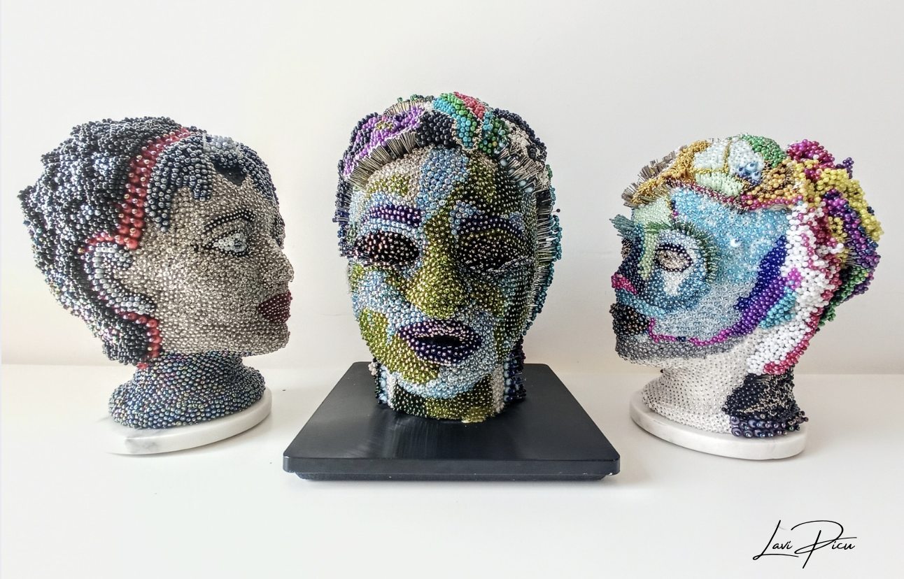 One of my ongoing series of sculptures is titled “Giving Shape to Pain.” These works are created using thousands of pins, needles, and glass beads embedded into sculpted heads. From a distance, they appear delicate and luminous. Up close, they reveal an uncomfortable truth.