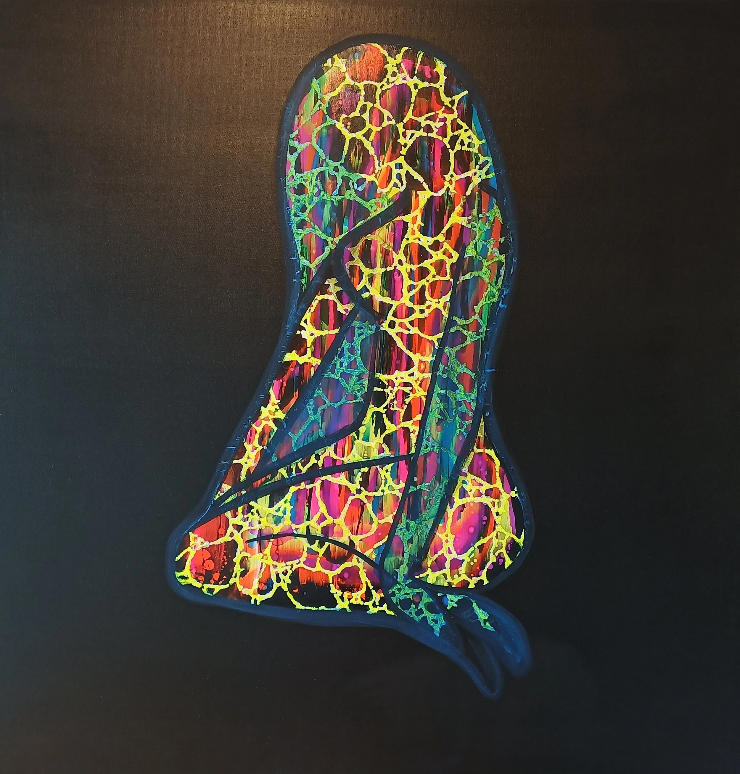 Layer upon layer of texture and haze blur the boundaries between thought and perception. Soft veils of pigment, metallic interference, and UV-reactive materials create shifting depths that mirror the disorientation, fatigue, and muted light that come with cognitive fog. Under natural light, “Fogged Up” feels subdued and introspective; under ultraviolet light, new colors awaken — representing moments of lucidity breaking through confusion.